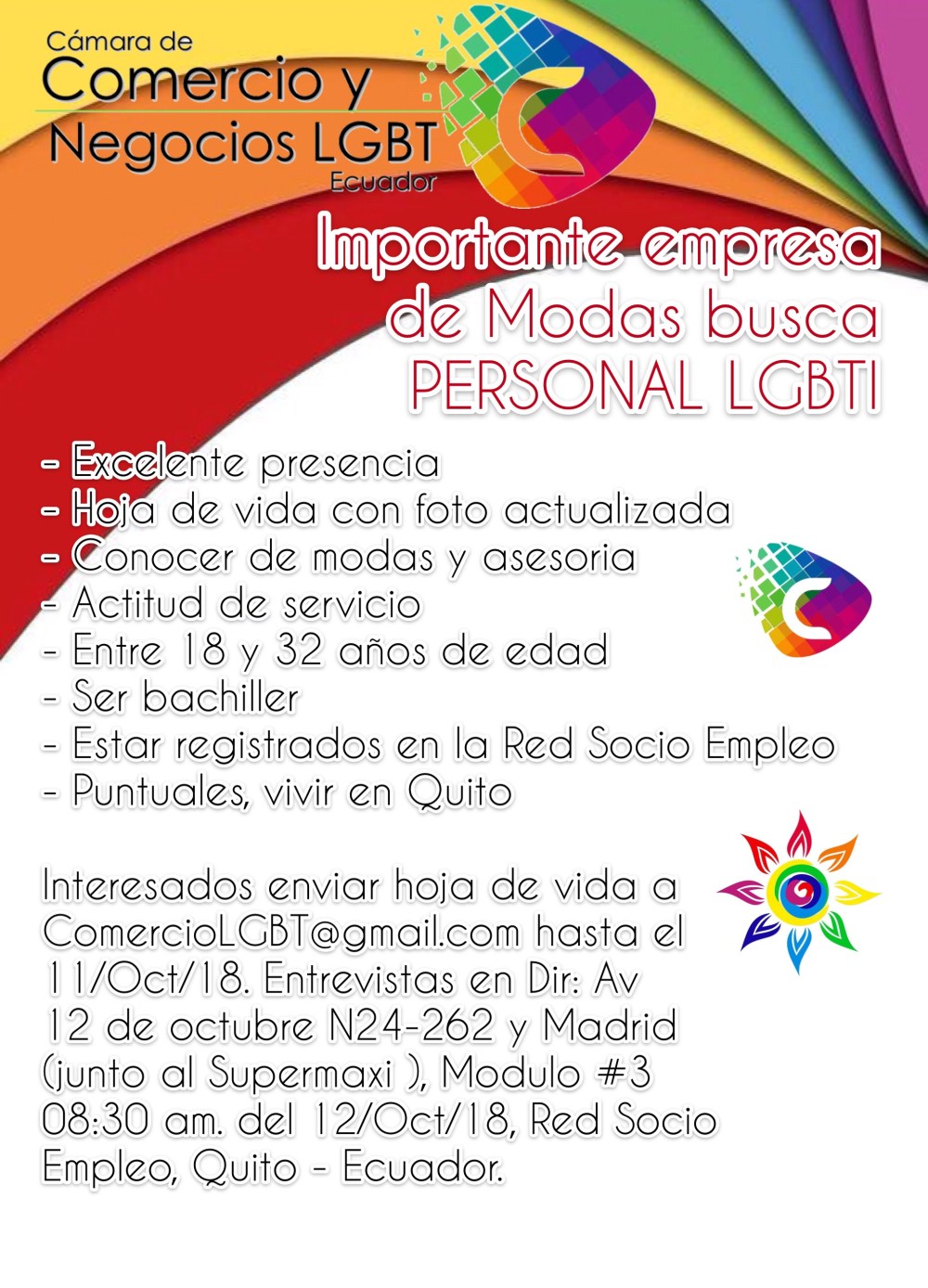 Interesados enviar hoja de vida a ComercioLGBT@gmail.com hasta el 11/Oct/18. Entrevistas en Dir: Av 12 de octubre N24-262 y Madrid (junto al Supermaxi ), Modulo #3 08:30 am. del 12/Oct/18, Red Socio Empleo, Quito – Ecuador.