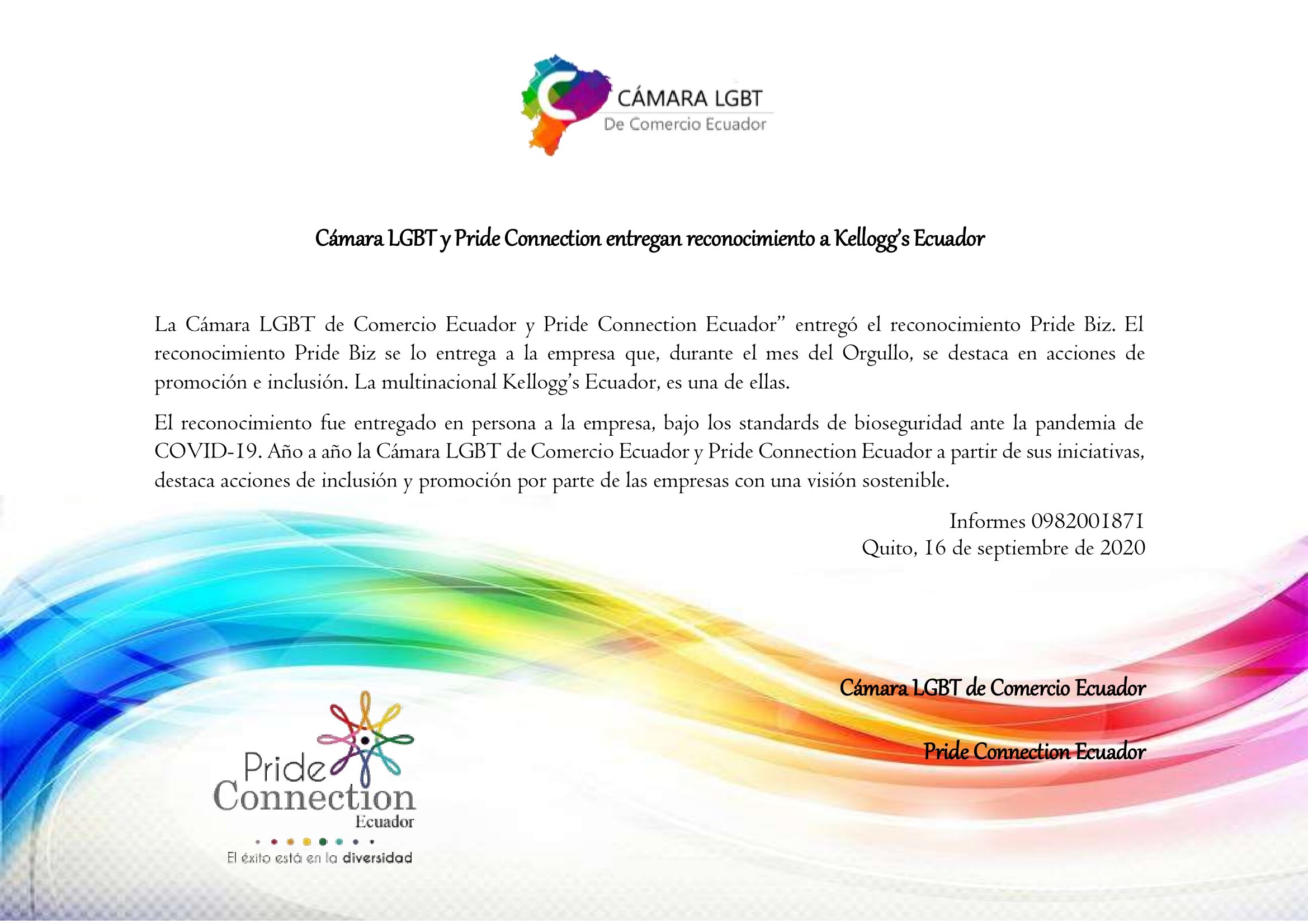 La Cámara LGBT de Comercio Ecuador y Pride Connection Ecuador” entregó el reconocimiento Pride Biz. El reconocimiento Pride Biz se lo entrega a la empresa que, durante el mes del Orgullo, se destaca en acciones de promoción e inclusión. La multinacional Kellogg’s Ecuador, es una de ellas.