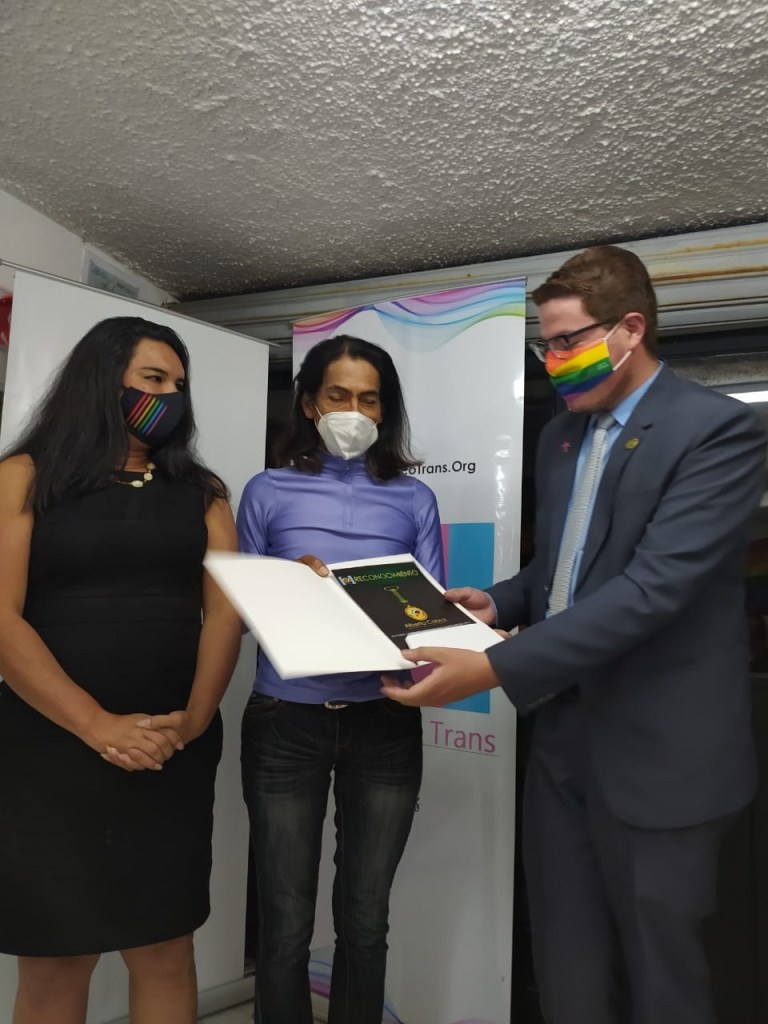 En ese sentido la CCLGBTEC, a través de Emilio Cruz, coordinador corporativo nacional, entregó un reconocimiento a Purita y Nebraska, por su contribución a la Despenalización de la Homosexualidad en Ecuador.